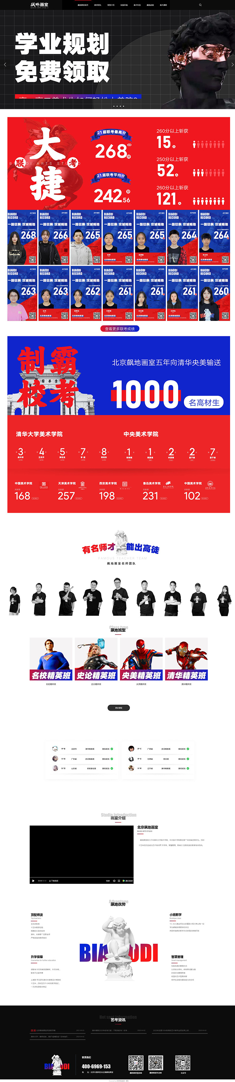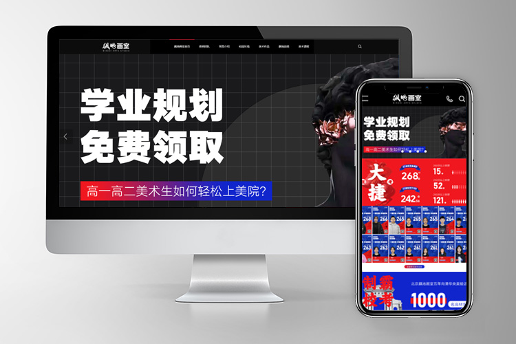 H5响应式企业网站建设,自适应电脑、平板、手机、微信,整个网站规划了首页、教师团队、班级介绍、校园环境、美术作品、飙地战绩、美术课程等栏目页面,后期也可以通过后台进行编辑修改、新增页面,涵盖企业官网建设标准功能服务,适合于教育培训、艺术考试等行业网站建设。
