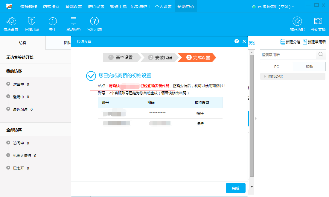 2.1 安装好客户端,登录商桥客户端,在主界面中打开“帮助中心”—“快速设置”,添加对应站点域名——下一步