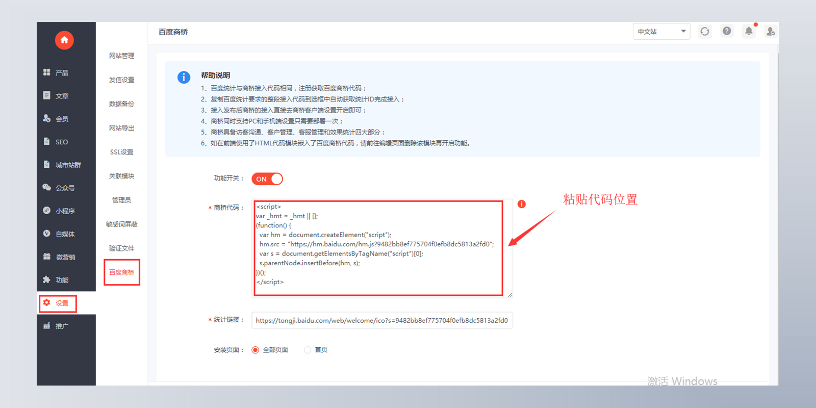 2.3 粘贴到网站后台——设置——百度商桥——功能开关开启——粘贴商桥代码。