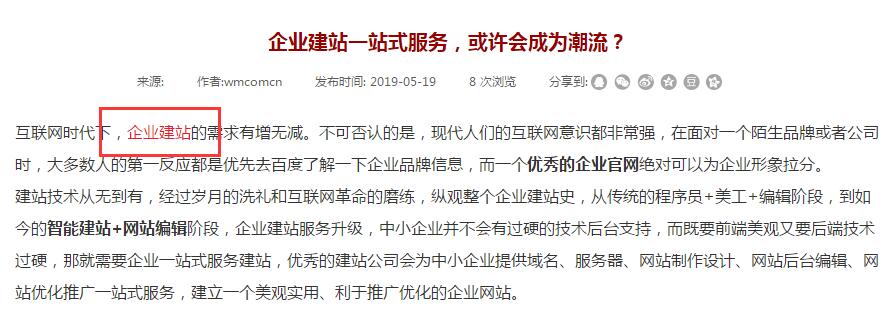 (2)文章中相同关键词只需要做一次链接。例如文章中出现了两次“企业建站”这个词,那么只需要把一个链接到首页即可,另一个不需要做链接。