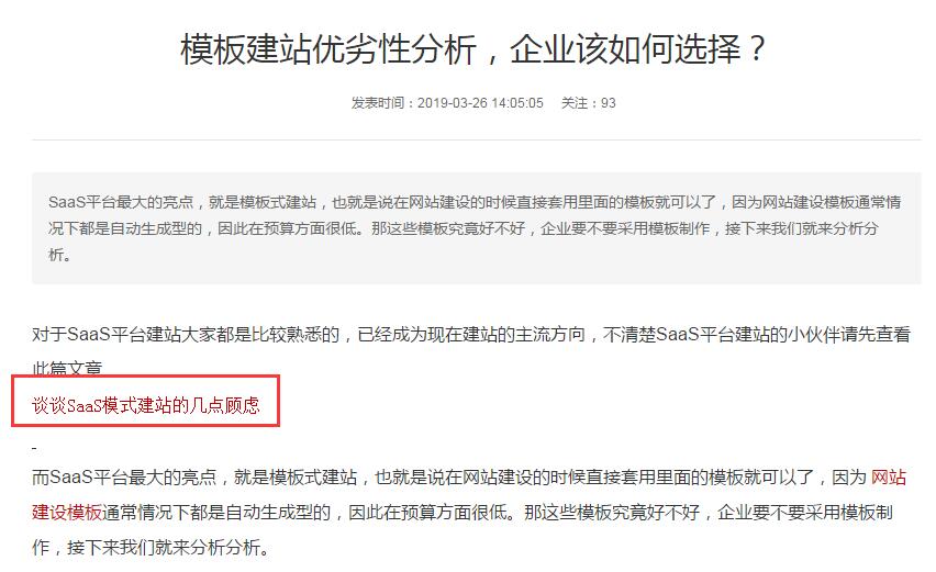 比如内容为“对于SaaS平台建站大家都是比较熟悉的,已经成为现在建站的主流方向,不清楚SaaS平台建站的小伙伴请先查看此篇文章谈谈SaaS模式建站的几点顾虑”,里面提到了“谈谈SaaS模式建站的几点顾虑”这篇文章标题,就可以把这个标题链接到对应的文章页面,而且链接的锚文本就是“谈谈SaaS模式建站的几点顾虑”,同时就可以给那篇文章传递权重,就能够获得排名。