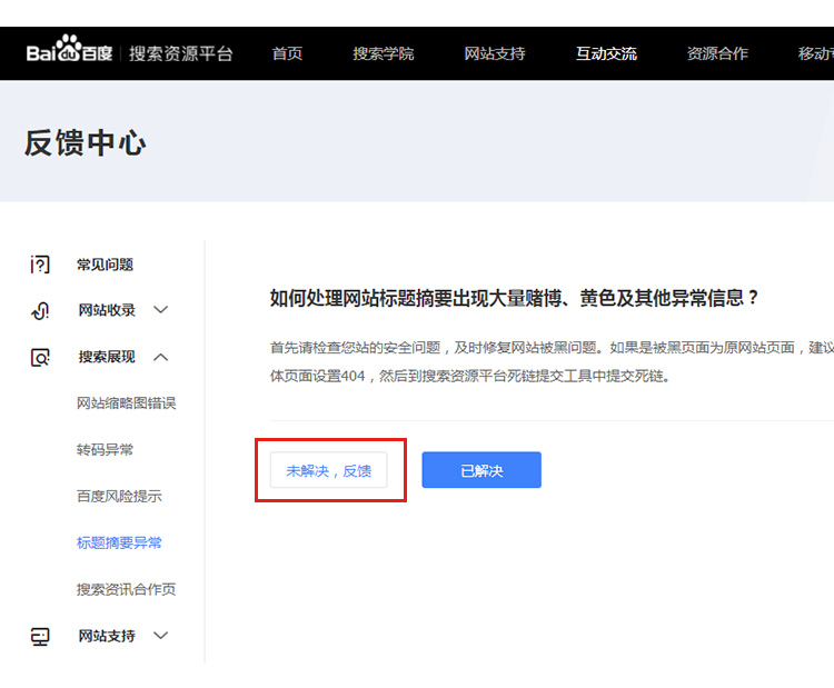 登录百度搜索资源中心,点击反馈中心 -> 搜索展现 -> 标题摘要异常 , 点击未解决反馈,选择对应的站点反馈,最快2天可以解决,在后台能查看到反馈情况。