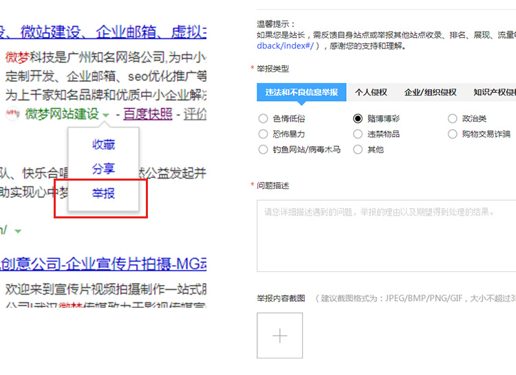 网站出现什么问题就对应举报什么,比如赌博博彩之类的,并且说明情况,是被恶意篡改,可别误报了。