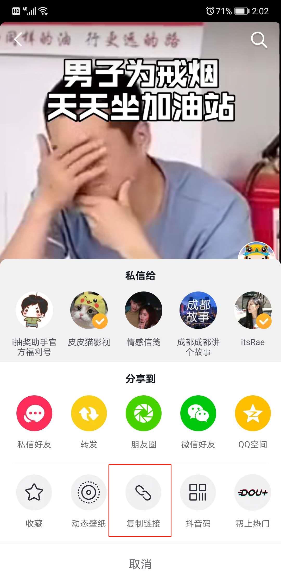 我们在抖音APP里,打开某一条视频,点击右侧下方的分享小图标,然后从弹出的底部菜单里选择复制链接,把复制的链接发送到电脑端来。